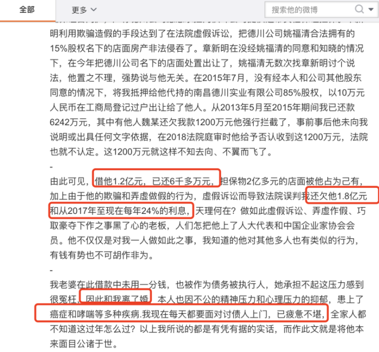 早在2020年,嫌疑人褚小强就曾在微博实名举报章新明,从举报信中,褚小强2013年为了收购南昌德川实业有限公司向章新明借了1.2亿元,但是,在整个过程中章新明利用私刻假章、伪造假合同等手段虚假诉讼,从而导致法院误判自己还欠他1.8亿元和从2017年至现在每年24%的利息。最终导致自己和妻子离婚,每天都要面对讨债人上门,自己也因为精神和心理压力的抑郁,患上了癌症和哮喘等多种疾病。