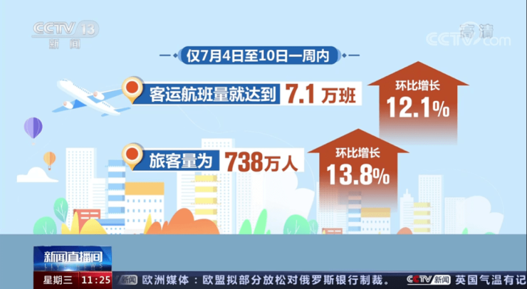 据央视新闻显示,仅2022年7月4日至10日一周内,客运航班量就达到7.1万班,环比增长12.1%;旅客量为738万人,环比增长13.8%。