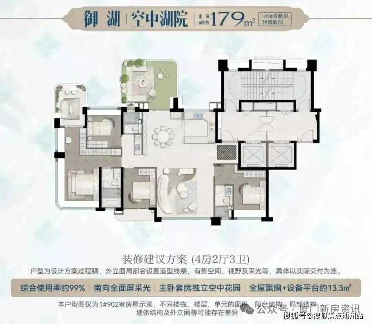望湖建面约179㎡户型,约30平双露台打造“空中湖院”,还带约10平的独立电梯厅,空间使用率高达近100%,层高约3.15米,约70m家庭欢聚空间,套内可比肩220m大平层。全屋6开间朝南,北向又几乎是全明露台和开窗,高区推窗尽揽约1500米宽阔湖面。