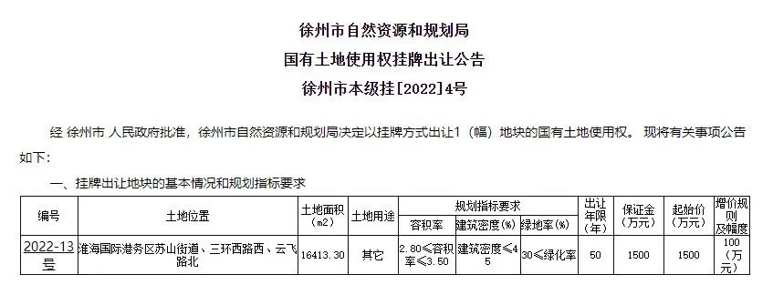 除此之外,在2月18日,徐州自然资源和规划局上还挂牌了一块2022-13号铜山物资市场地块,用途为医疗卫生用地。地块位置:淮海国际港务区苏山街道、三环西路西、云飞路北。