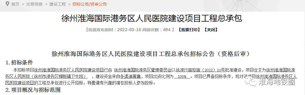 小编看到,3月16日,徐州公共资源交易平台上,发布了关于淮海港务区人民院建设项目工程总承包的招标公告。