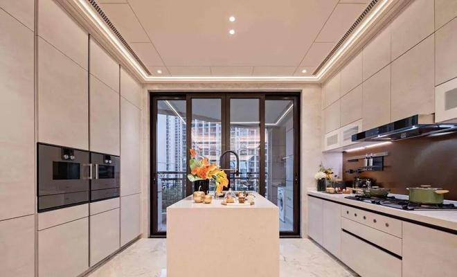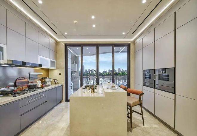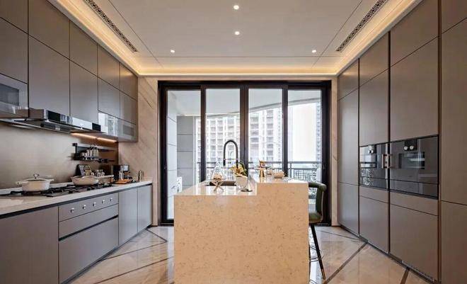 墙壁使用香雪灰奢石,厨房门采用玫瑰金金属外框玻璃门;