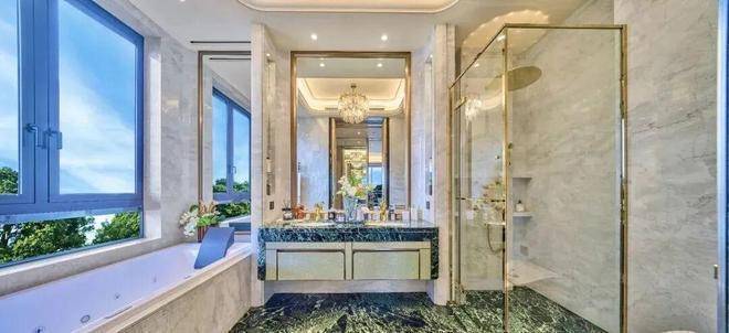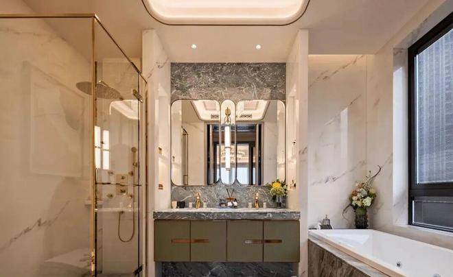 主卧浴室墙面采取马德望白奢石,地面是普拉达绿奢石;