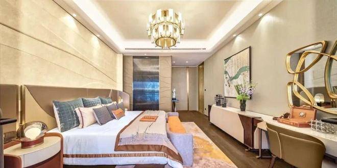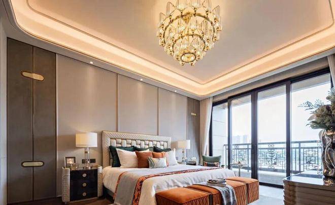 主卧承接青绿山水的主调,扪皮主材点缀金属线,现代与古典相融;