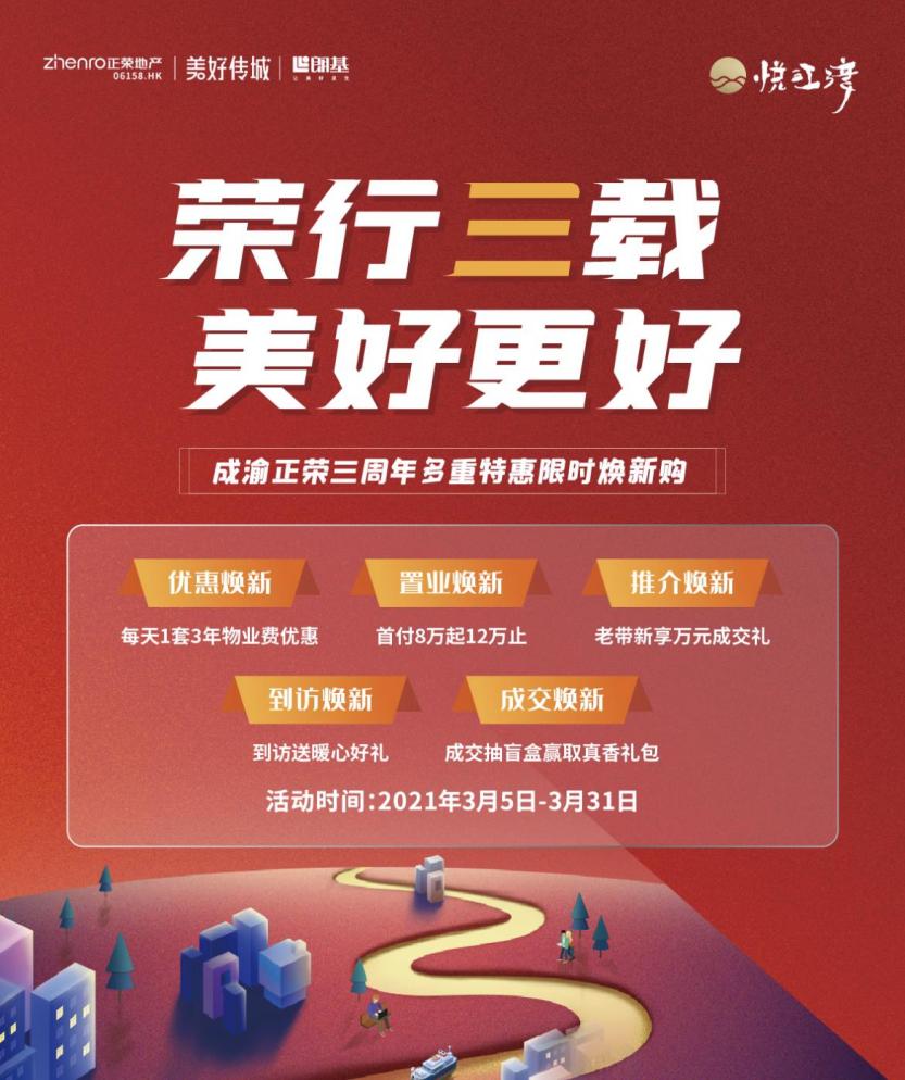 荣行三载,美好更好!这趟开往幸福的轻生活列车正停靠在成渝正荣三周年庆的节点上,多重特惠福利,助力轻松上车!每天1套3年物业费优惠、老带新享万元成交礼、到访送暖心好礼、成交抽盲盒等多重焕新豪礼,为美好赋能,让美好更好!