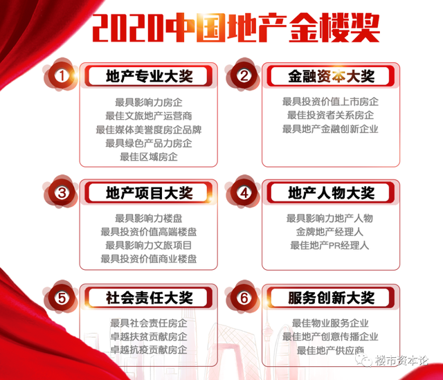 六大奖项下又包括十几个分类奖项,涵盖影响力房企和人物、投资价值、金融创新、扶贫抗疫等多个奖项。