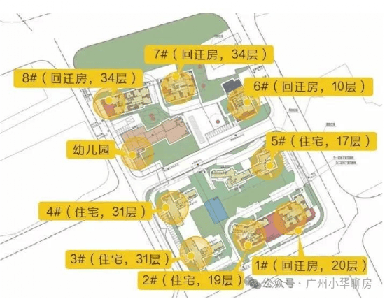 总栋数:共8栋塔楼(1#、6#、7#、8#为安置住房),3栋商业,1所幼儿园