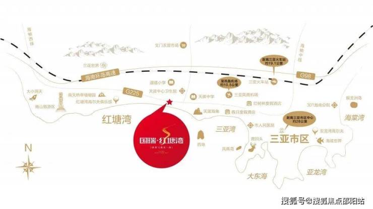 本项目位于三亚天涯海角与海上观音景区两景区中间的正南向海湾——红塘湾旅游度假区的东南侧,与西岛隔海相望。距离三亚市中心约28公里;至凤凰机场约10.5公里;距三亚火车站(动车站始发地)约19.1公里。紧邻G225国道,距离环岛高速2.5公里,16路、25路公交车往返于三亚市中心与红塘湾。