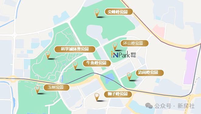 六大连廊七大公园,漫步城央公园里,七大公园(环山岭公园、科学城体育公园、尖峰岭公园、牛角岭公园、玉树公园、狮子岭公园和边岗岭公园)在旁,形成13.12KM的环山绿道连廊,于青绿中私享自然静谧清新,告别钢筋水泥丛林的沉闷与呆板,畅想喧嚣之外的绿色富氧、舒适自然的商务景观空间,赋能企业坐享绿色商务头等舱。