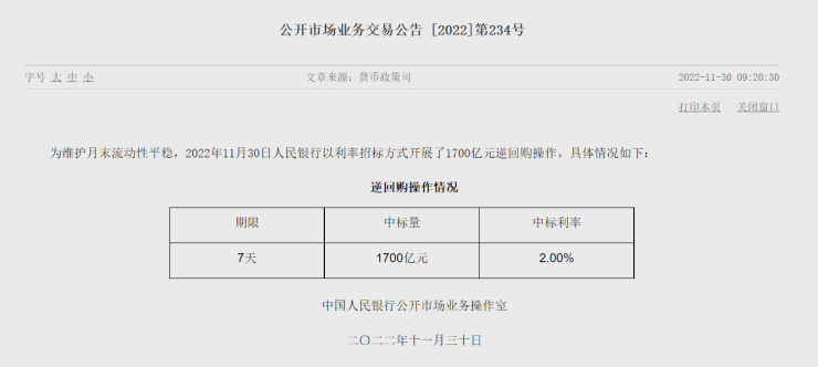 焦点财经讯 耿宸斐 为维护月末流动性平稳,2022年11月30日人民银行以利率招标方式开展了1700亿元逆回购操作,中标利率为2.00%。