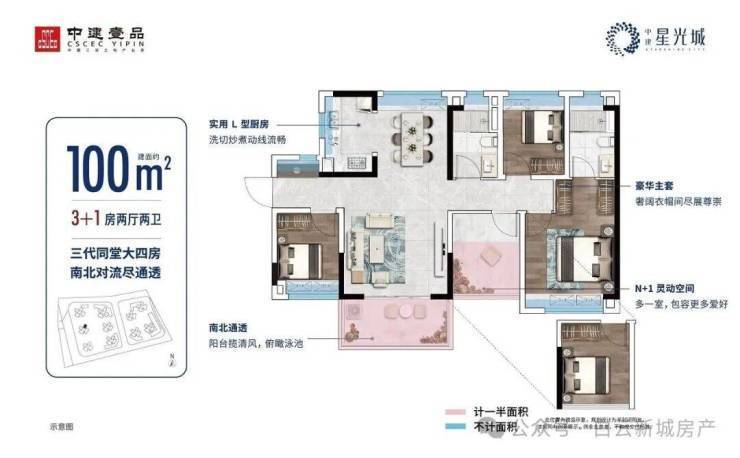 中建星光城主打“高实用率+全南向”产品哲学,全系户型实用率高达94%-96%,远超市场平均水平。主力在售面积段为69-100㎡,精准切中刚需及刚改痛点: