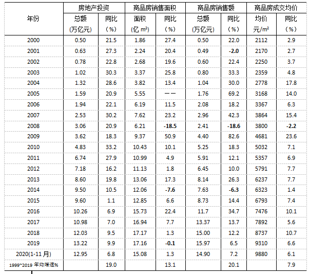 不计入物价上涨因素,20年来中国房地产投资额增长31倍,年均增速19.0%;商品房销售面积增长近12倍,年均增速13.1%;商品房销售额增长38倍,年均增速20.1%;商品房成交均价上涨3.5倍,年均增速7.9%;按一家3口人,人均30m2计,全国城镇房价收入比由房改初期5年平均9.5下降到最近5年平均6.6。
