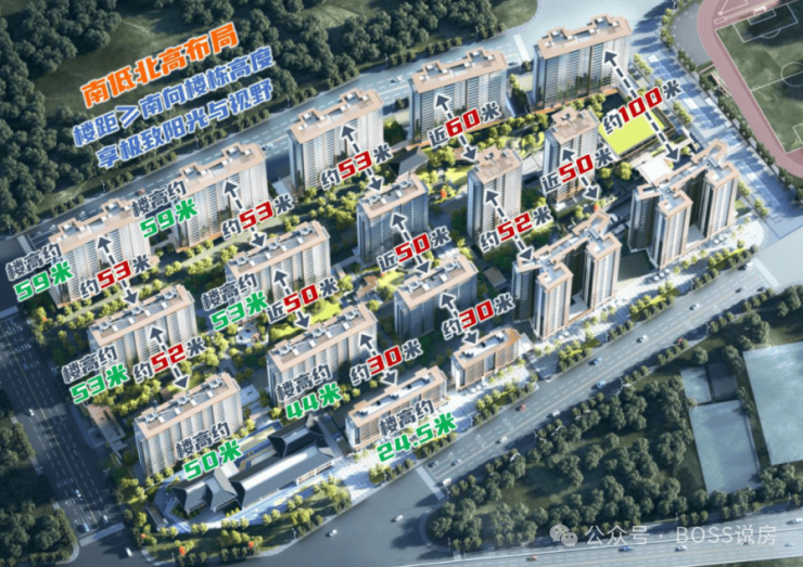 层高24.5米-59米,高8-20F,楼间距最小的是30米,最大的达到了100米;