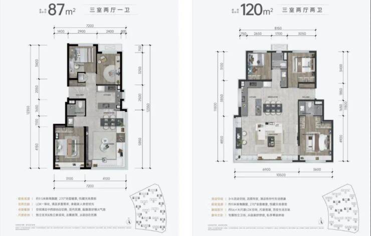 预算多一些的伙伴,更可以考虑上车87平米或120平米的户型,在拥有舒适生活的同时,更可以享受270°转角飘窗的采光和观景!