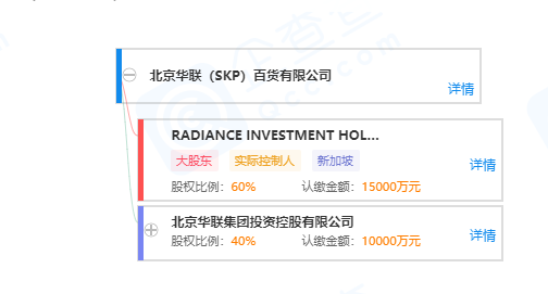 焦点财经查询获悉,SKP的全称是北京华联(SKP)百货有限公司,成立于2007年,由台湾新光三越与北京本土品牌华联合作成立。彼时SKP的名字为新光天地,之后北京华联逐渐取得新光天地控制权,并更名为SKP。目前由新加坡公司RADIANCE INVESTMENT HOLDINGS.LTD(新加坡光辉投资控股私人有限公司)、北京华联集团投资控股有限公司分别持股60%、40%股权。