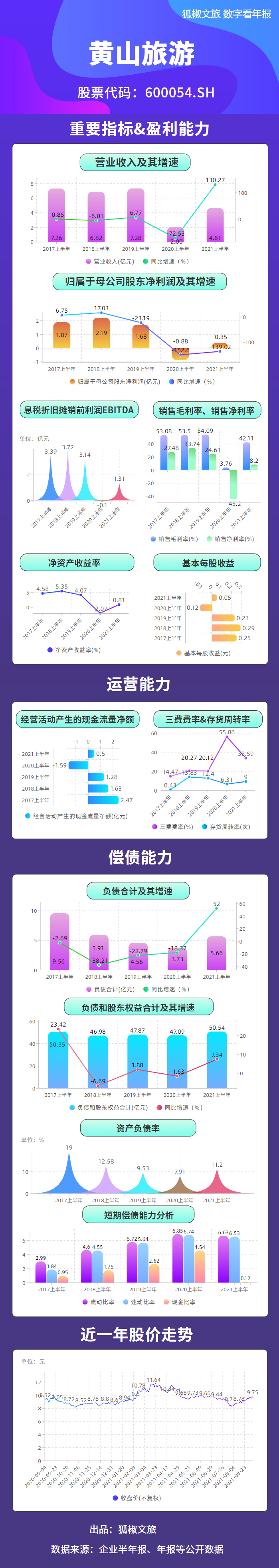 8月27日,黄山旅游发展股份有限公司(A股股票代码:600054)发布2021年半年度报告。今年上半年,黄山旅游实现营收4.61亿元,较去年同期增加2.61亿元,增幅130.27%;归属于上市公司股东的净利润为0.35亿元,同比扭亏为盈;扣除非经常性损益后净利润0.16亿元,上年同期为亏损1.05亿元;基本每股收益0.05元。截至本报告期末,黄山旅游总资产为50.54亿元,同比上涨3.27%。