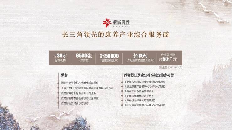 以南京为本部,业务覆盖南通、苏州、杭州、镇江等地区,形成城市级医养综合体—社区型养护机构—居家养老三位一体的全面康养产品体系。