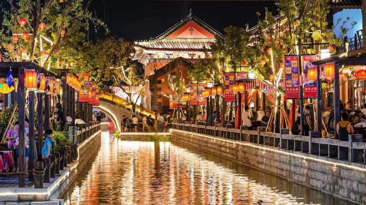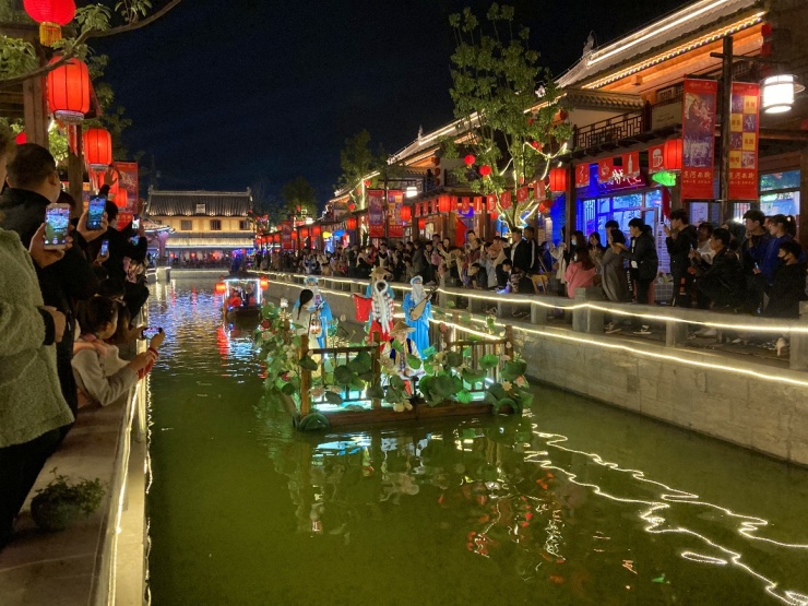 旁边的月老亭每晚都上演着月老与孟婆的悲欢离合。运河上还会有祝英台小姐姐的水上演出。