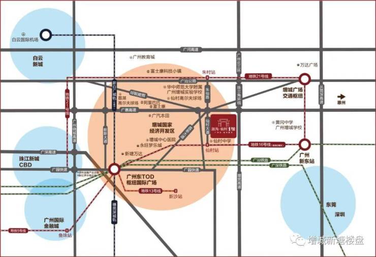 项目位处广州东TOD枢纽国际广场及广州新东站的中心,地铁16号线(仙村站在旁)连通两大交通枢纽,穗莞深城际新塘南站1站到东莞,6站直达深圳,未来直通前海。周边6大高快速路环绕(广惠、广园、广深、北三环、增莞、花莞),40分钟直达珠江新城,高速20分钟即达东莞。