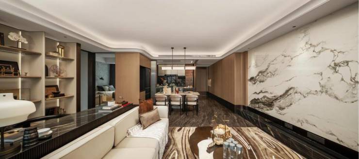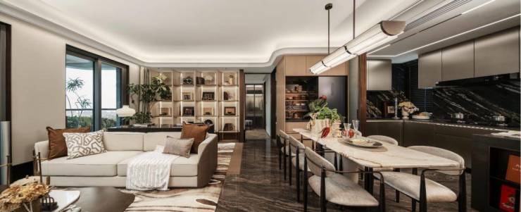 - **布局特点**:一层一户设计,电梯独立入户;客餐厅一体化布局,面宽超12米,搭配全景落地窗;主卧区包含书房、衣帽间及双台盆卫浴,堪比五星级酒店套房。