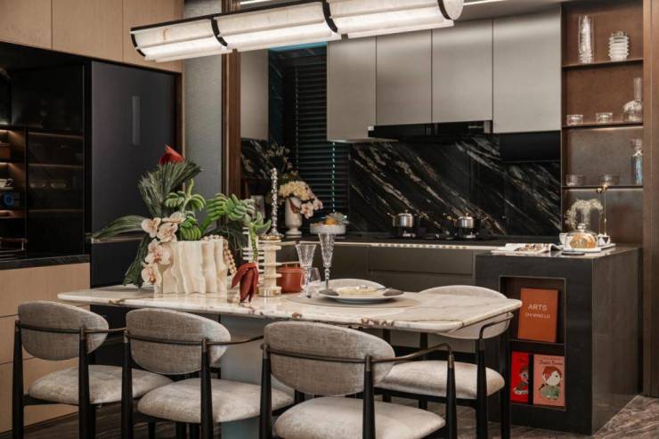 - **细节亮点**:约6.8米宽景阳台连接客厅与次卧,提升采光面;厨房采用L型操作台与双开门冰箱位,预留洗碗机空间;玄关处设置约1.5㎡储物间,收纳效率高。