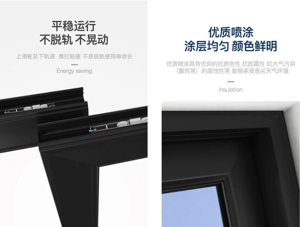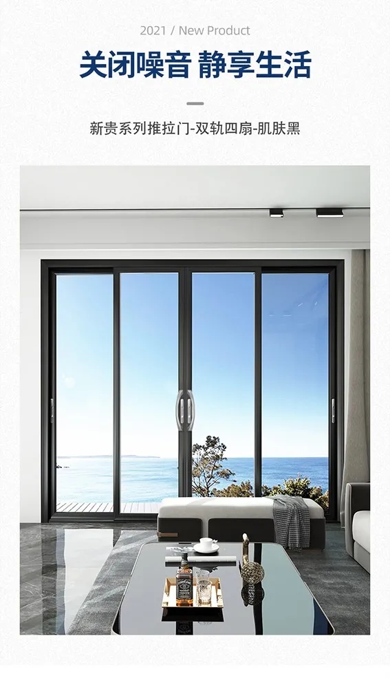 亿合门窗新贵系列推拉门采用高承重双滑轮设计,使得推拉更加平稳顺畅,且无噪音。采用氟碳喷涂处理工艺,使推拉门不褪色,长期使用依然历久弥新。