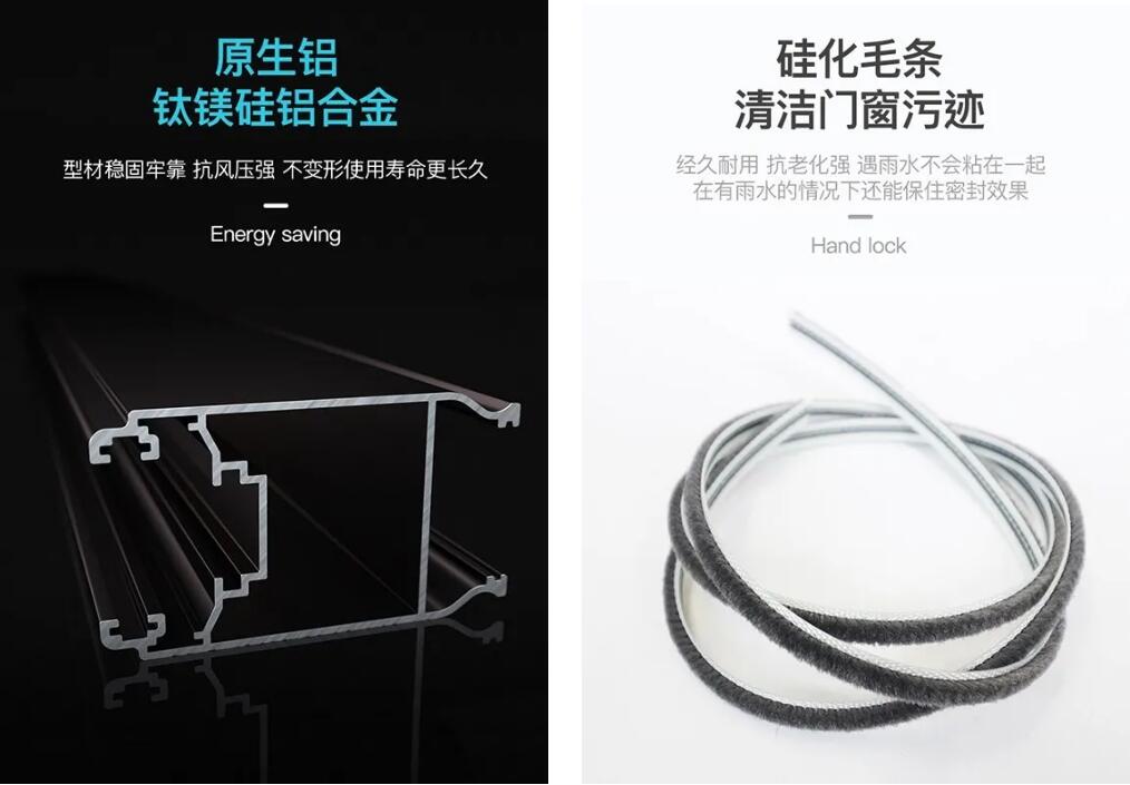 工艺上,采用稳固的原生铝合金型材,抗风压强,不容易变形。加上耐用的硅化毛条,清洁门窗污渍的同时能够防止与雨水黏在一起,密封效果显然易见。