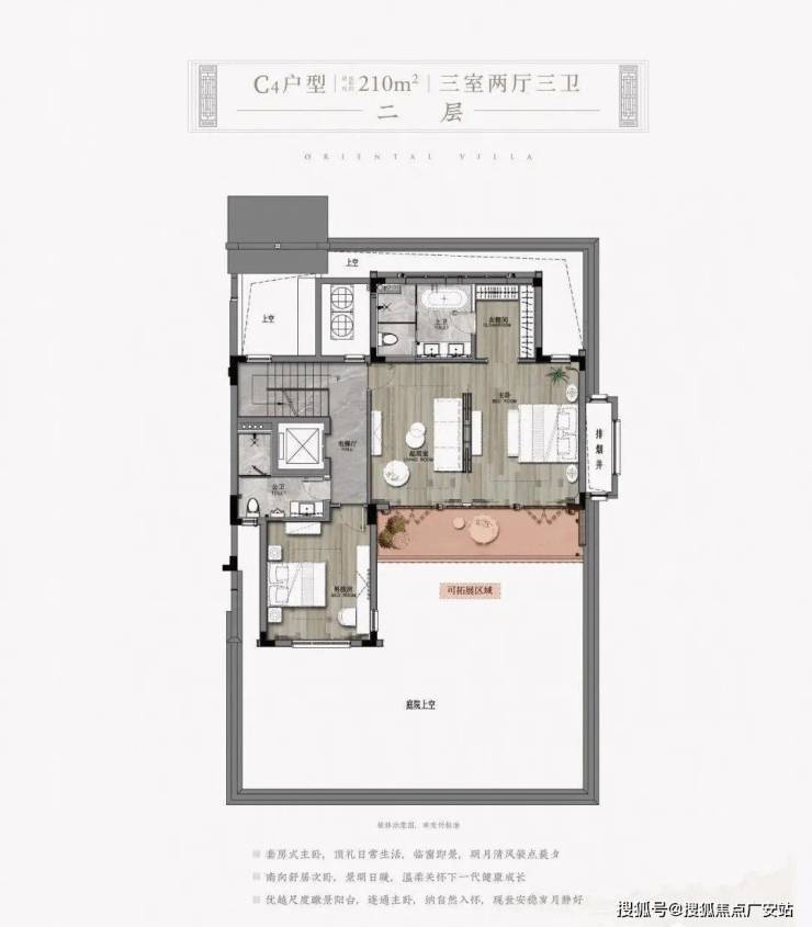 比如它210㎡以上就做到了三开间朝南,部分边套花园甚至能到400-500㎡。