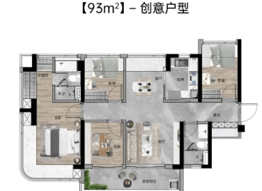 93㎡四房两厅两卫:东南向,使用率109%,独立入户玄关,南北通透,四面宽极致视野,主卧270°弧形玻璃幕窗。