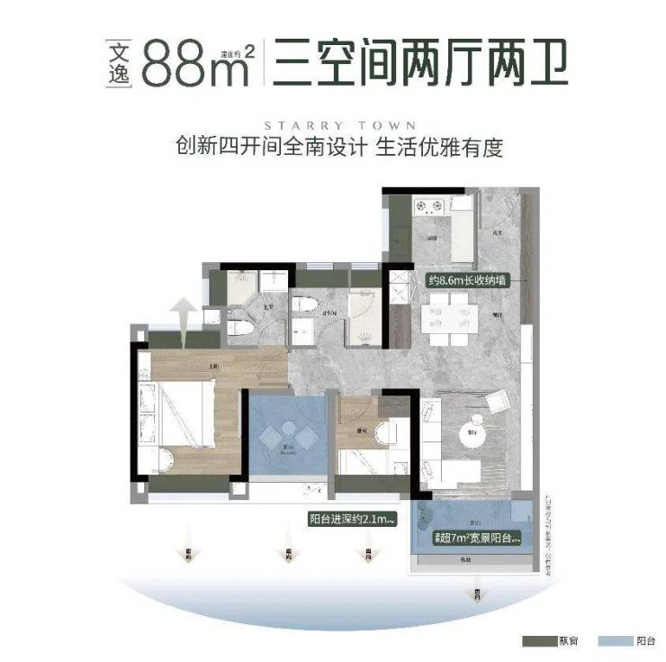 88㎡3空间2厅2卫,四开间朝南,超11米景观线,南向约500米无遮挡。