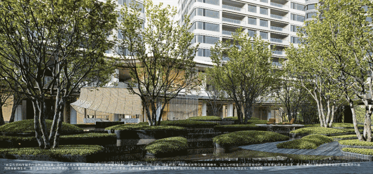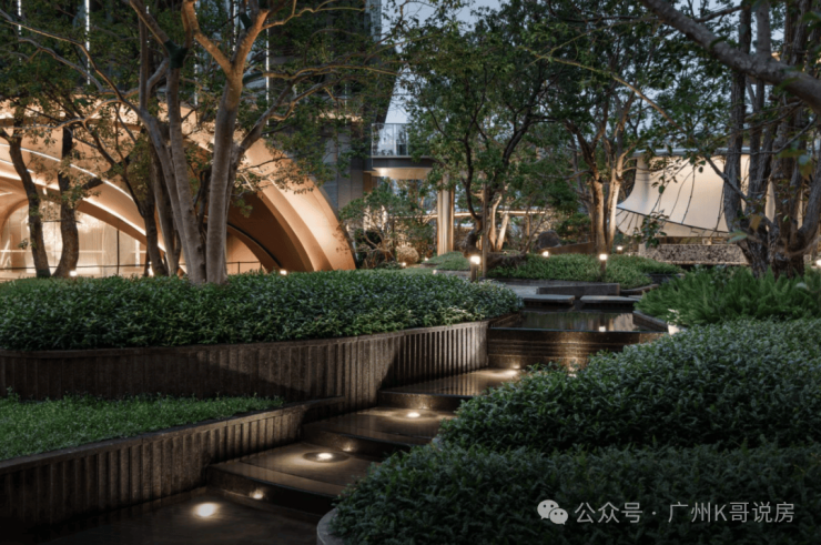 水流从入口叠水瀑布倾泻而下,奔向中央镜面水池,再沿着步道溪流蜿蜒流至全园各处,业主们沿着步道漫步,能依次体验 “听水的舒缓、观水的灵动、亲水的惬意”,这是传统平面园林没有的感受。