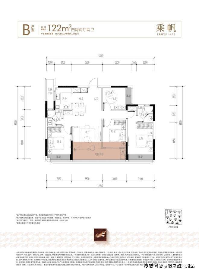 ❸建筑面积约122㎡户型,4房2厅2卫,含赠送得房率约92%。