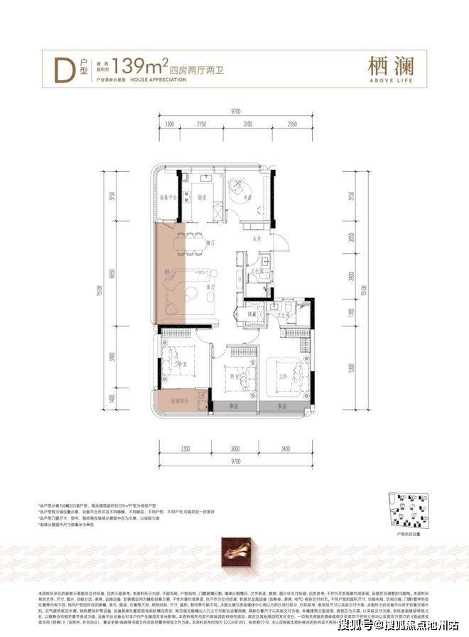 ❶建筑面积约139㎡D户型,4房2厅2卫,含赠送得房率约91%。