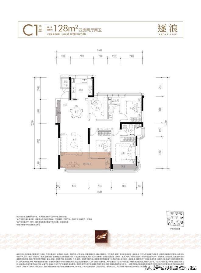 ❷建筑面积约128㎡C1户型,4房2厅2卫,含赠送得房率约91%。