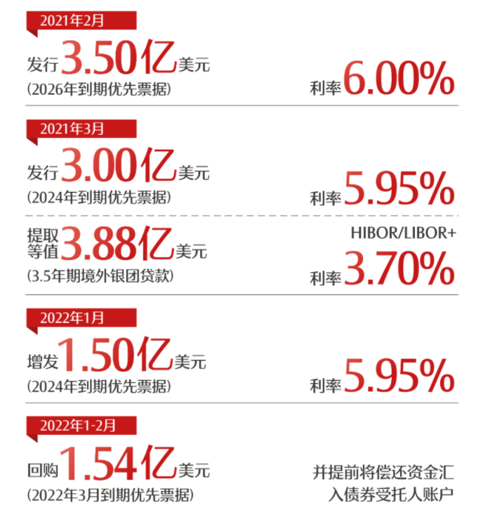 2021年2月,中骏成功发行2026年到期的3.5亿美元利率6%的优先票据;2021年3月,发行2024年到期的3亿美元利率5.95%的优先票据,并于同期,提取等值3.88亿美元3.5年期境外银团贷款,利率为HIBOR/LIBOR+3.7%;2022年1月,中骏集团增发2024年到期的1.5亿美元利率5.95%的美元债,并于同期2022年1-2月,于公开市场合共回购1.54亿美元2022年3月到期的优先票据。
