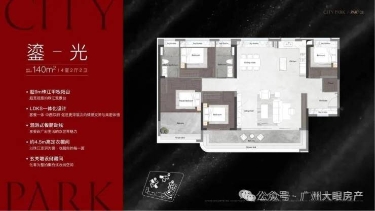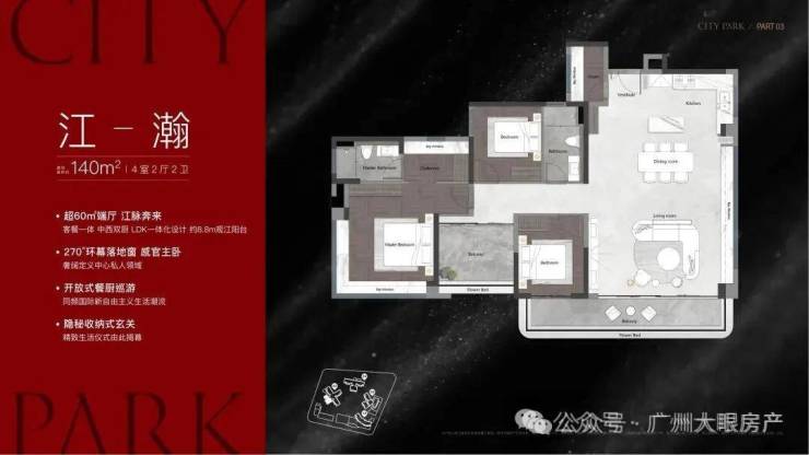 该栋为25层高,两梯三户设计,只有两个面积段,120㎡和140㎡,户型做得不错,在景观展现上用了功,极大程度去放大观江面,比方说超宽阳台、L型主卧转角飘窗、客厅预留观景飘窗等等,主打改善户型,2025年9月整体交房