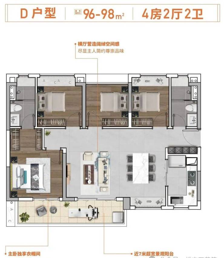 【约96-98㎡4房2厅2卫户型鉴赏】南向横厅大四房,约7米宽景阳台