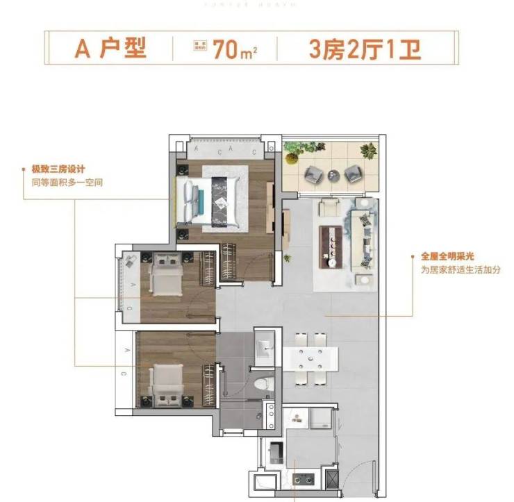【 约70㎡ 3房2厅1卫户型鉴赏】片区唯一,超低门槛小面积户型