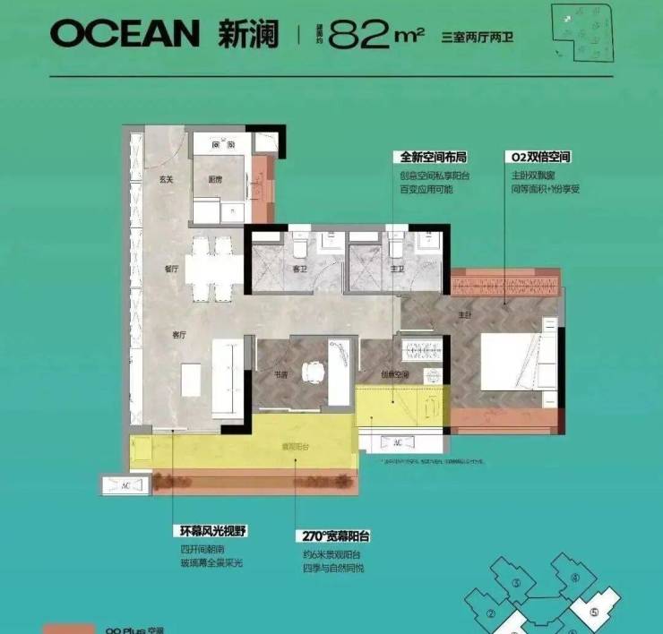 小户型竟配置了媲美豪宅的超大270度景观阳台,74/76平阳台约5.5米长,82平阳台约6米长,可以在阳台喝茶、瑜伽、看书……