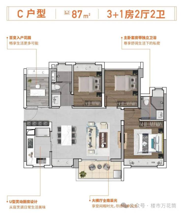 【约87㎡3+1房2厅2卫户型鉴赏】全南向横厅4房,二孩家庭至爱