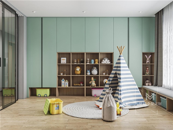 为了孩子成长需求,特意预留一个空间,作为休闲室,定制一个属于孩子的“童话世界”。玛格魔方--童趣成长系列,运用整面灰湖绿收纳柜,将杂物尽数收纳;中部设计镂空格子,能锻炼孩子自主动手摆放杂物;小帐篷的出现,营造浪漫童话的意境,满足孩子对美好童话的向往。