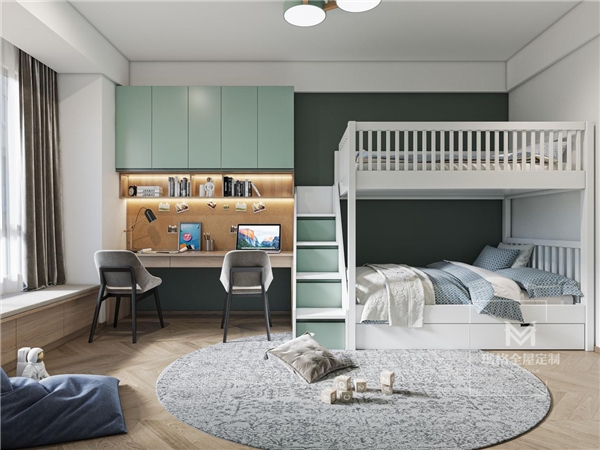 灰湖绿+白色,营造出柔和的视觉空间,有利于孩子安定情绪和安心入眠;设计吊柜+书桌,学习、收纳都能井然有序地进行;上下床的设计形式,打造宽敞的休憩空间,有利于孩子和谐相处、情感交流更亲密;中间的地毯预留自由活动空间,满足孩子活蹦乱跳的天性。