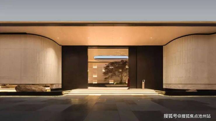归家第一幕——长约68米超尺度府门界面,选用浅黄色沉香米黄石材为大门主体,通过对石材肌理审慎遴选与工艺把控,搭配流光溢彩洗墙灯效果,给整个社区奠定了温润典雅的基底氛围。