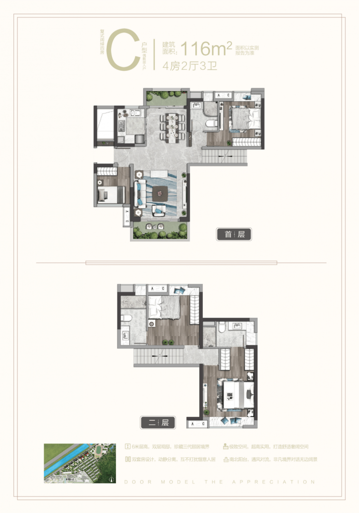 其三,拥有6米挑高,带来双倍视野享受。而且,由于项目依山而筑,更可享受开阔的山景,推窗便是满山绿意。
