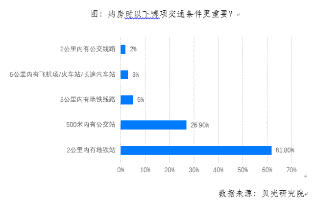 在核心要素排名排名前列的交通条件中,受访者表示地铁站点和公交站点的权重明显高于其他因子,地铁站周围2公里内的房屋均价明显高出不在这个范围内的房屋均价,地铁站对房价具有明显的溢价效应。