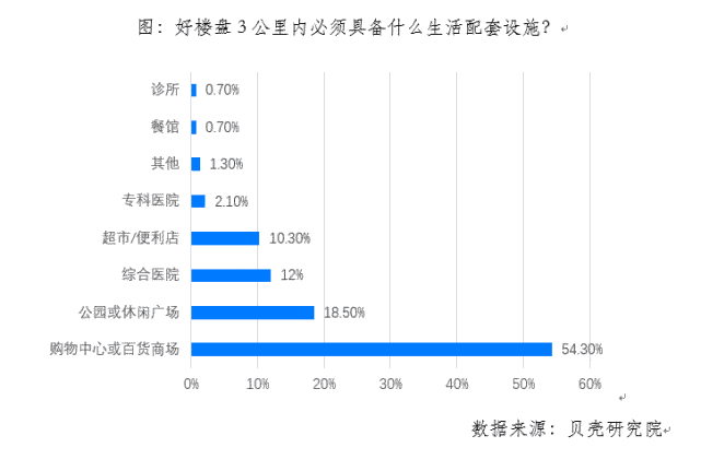 在贝壳研究院的本次研究报告中,生活配套、小区规划、户型设计对消费者而言的重要性也相对较高,是购房时仅次于交通、教育、区位的衡量因素。调研发现,购物中心或百货商场的重要程度要远高于其他生活配套设施。“15分钟生活圈”可实现的线下购物体验,是品质生活不可或缺的重要一环,成为置业时优先考虑的因素。此外,贝壳研究院对北京的473个公园进行案例分析发现,七成公园一公里直线距离范围内的小区成交均价高于对应商圈均价。数据结果还显示,相比物业、教育、购物中心及公园等因素,三甲医院对周边住宅价格的影响程度较小,如果医院跟小区距离过近,甚至会成为嫌恶设施。这也从侧面验证了需求侧对其重要性的评价。