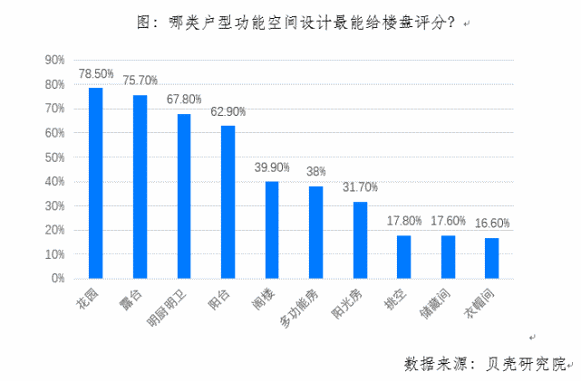 在房屋内部布局方面,更小的公摊面积,更高的得房率,仍是消费者关注布局设计的最重要因素。同时,随着新生代对居住品质的要求,打开窗户,春暖花开逐已成为“标配”需求。据本次调研的14万份数据显示,花园、露台成为受访者最关注的居住空间设计,其次是明厨明卫,对于传统的阳台而言,其重要性并不是较高的,排在第四。