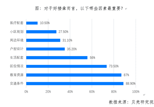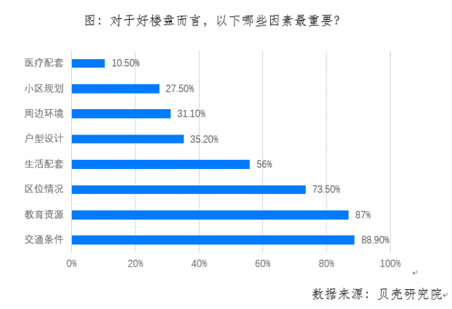 报告显示,在交通、教育、医疗、区位、生活配套等八大主要影响因子中,交通条件、教育资源和区位情况成为对消费者影响较大的三个主要因素,对消费者的购房决定影响权重较高。