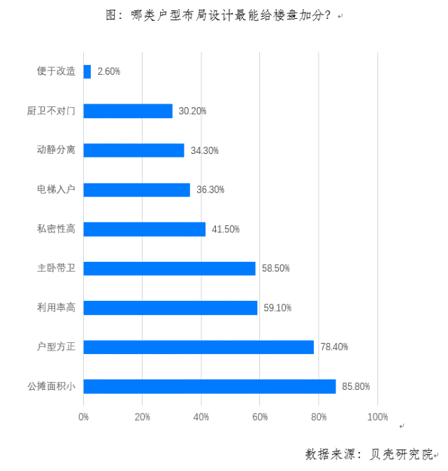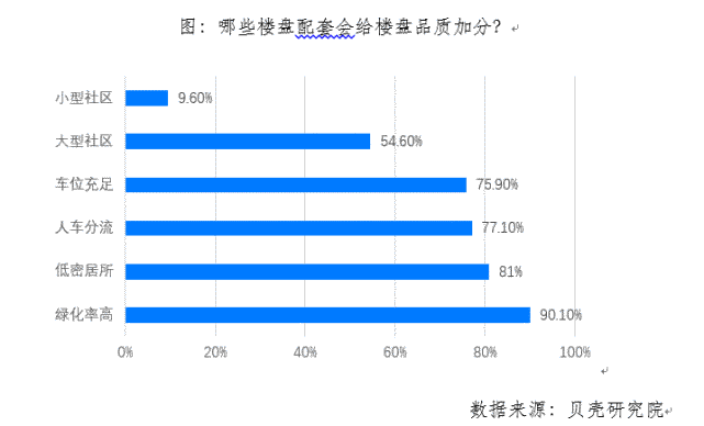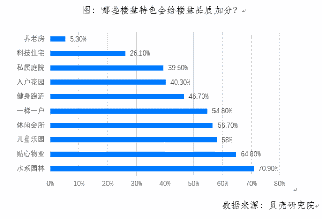 此外,还有一些楼盘特色也会给楼盘品质加分,在调研中发现,水系园林设计、贴心物业成为楼盘品质的加分项,此外小区内有儿童乐园、休闲场所、一梯一户等特色设计也会给楼盘加分。