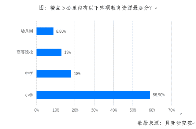 在教育因素上,幼儿园、小学、中学及高等院校等,不同类型教育资源的重要性之间也存在差异,通过调研,我们发现小学是购房群体最关注的教育配套因素,也是改善型客群换房的主要动力之一。